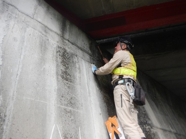 ひびわれ、うき、はく離・鉄筋露出といった外観変状調査は近接目視で行います。