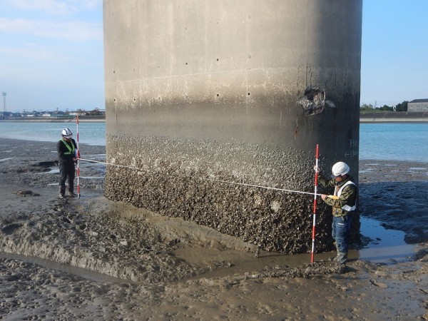 徒歩で近接できない場合は、調査方法でも述べましたが、種々の機材を使用して調査対象部材に近接した状態で、目視により変状の種類と程度とを確認します。現場ではスケッチや写真として記録し、持ち帰ったデータは損傷図やそれに対応した損傷写真として整理します。